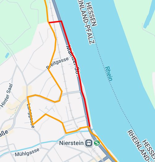 Meine spätere Recherche ergab, dass man die Bundesstraße, die in Nierstein Mainzer Straße heißt, weiterfährt bis zum Haus mit der Nummer 92. Dort führt eine schmale Gasse nach weniger als 80 Meter direkt zum Kiliansweg, der den weiteren Verlauf des Eurovelo 15 bildet. Eventuell ist dieser Weg sogar noch immer ausgeschildert. Allerdings muss ich zugeben, dass diese kürzere Strecke eben 800 Meter mehr auf einer Bundesstraße bedeuten.