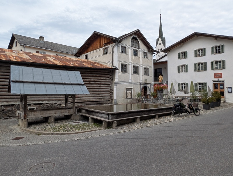 Ab Rueun ist die Strecke bis nach Chur komplett asphaltiert. Zunächst geht es immer am Rhein entlang. In Ilanz verlassen wir ihn. Ab da geht es langsam aber stetig bergauf. Kurz vor Valendas hören wir hinter uns eine Stimme: „Gruezi, mit Windschattenfahren ist da leider nicht viel drin.“ Es ist ein Radrennfahrer mit dem wir uns kurz unterhalten, bevor er uns locker flockig wieder davonfährt. In der Ortsmitte von Valendas treffen wir ihn am Holzbrunnen wieder. Der Brunnen ist aus dem Jahr 1760 und mit seinen 4,8 x 12 Meter einer der größten Europas ist. Das Wasser besitzt Trinkwasserqualität.