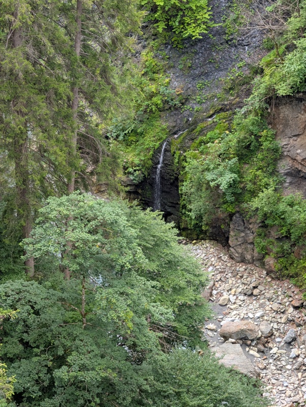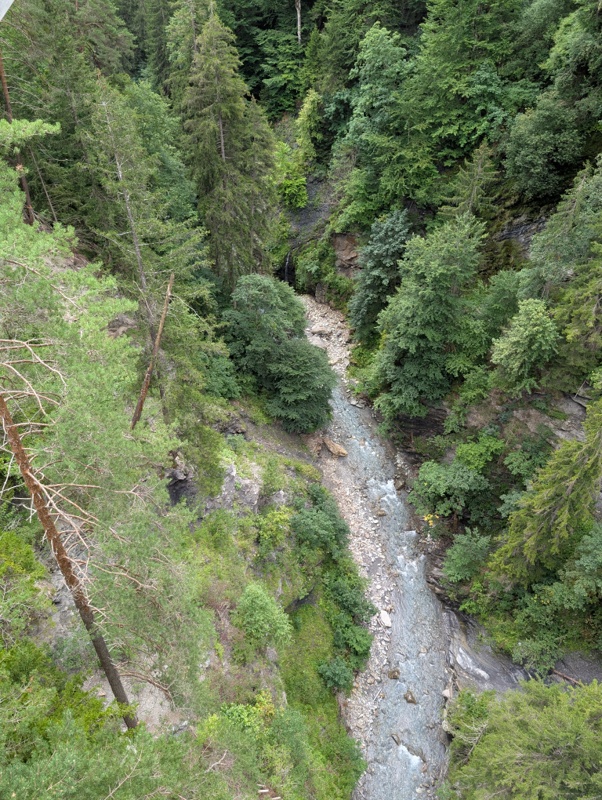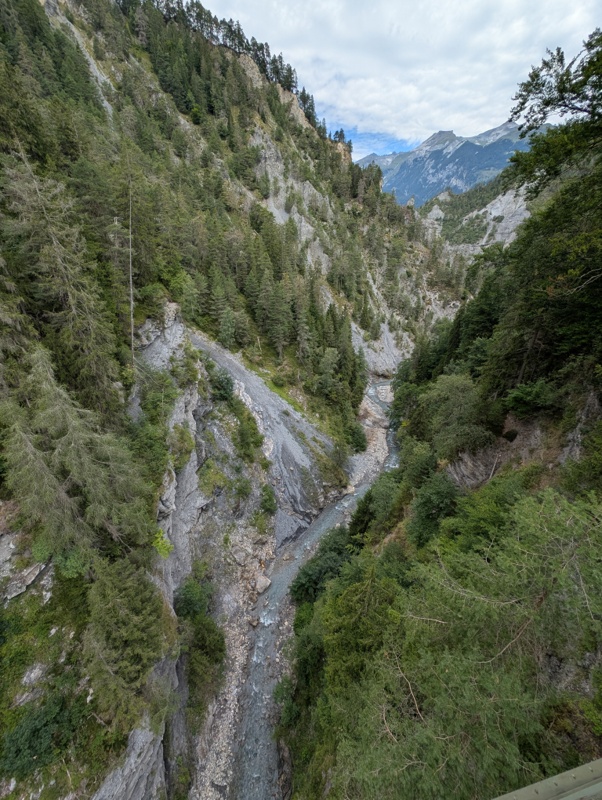 Danach geht es weiter über Carrera nach Versam. Wir befinden uns dort schon auf über 900 Meter Höhe. Hinter Versam geht es aber in Serpentinen wieder steil hinab zur alten Versamer Tobelbrücke von wo aus man einen wunderbaren Blick in die Schlucht der Rabiusa hat. Über die neue Brücke verläuft dagegen der Verkehr.