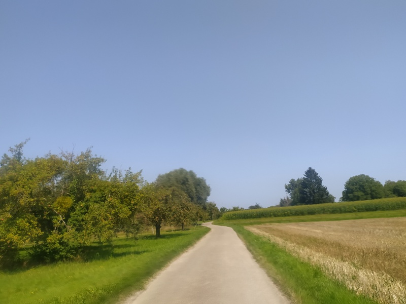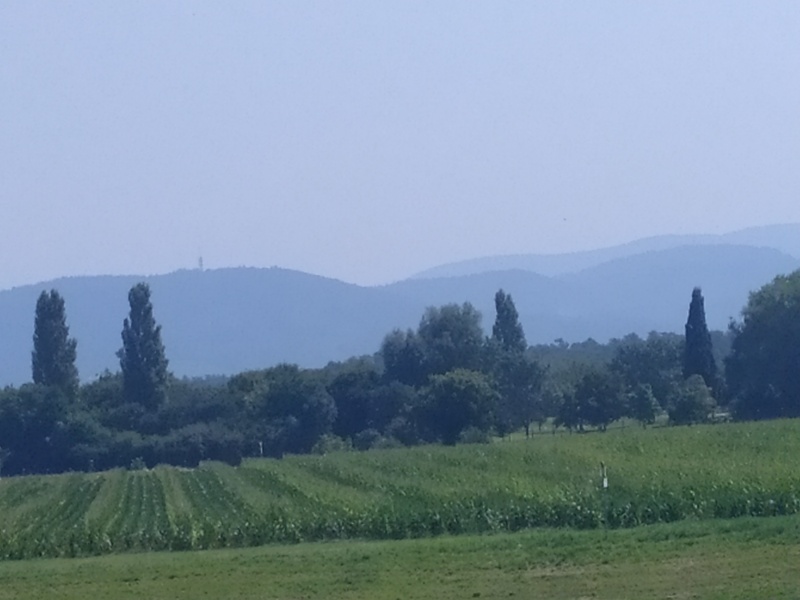 Bis Wintersdorf fahren wir in oder am Rhein entlang. Mal führt der Weg auf dem Damm entlang, mal auf der Straße unterhalb. Der Damm ist geschottert, aber recht gut fahrbar. Tempo kann man allerdings nicht machen. In Plittersdorf füllen wir unsere Vorräte im kleinen Lebensmittelladen auf; gekühlte isotonische Getränke gibt es dort aber nicht. Ab da entfernen wir uns immer weiter vom Rhein. In Rheinstetten zweigen wir dann vom Eurovelo ab, da unser Hotel „Beim Schupi“ abseits davon liegt.